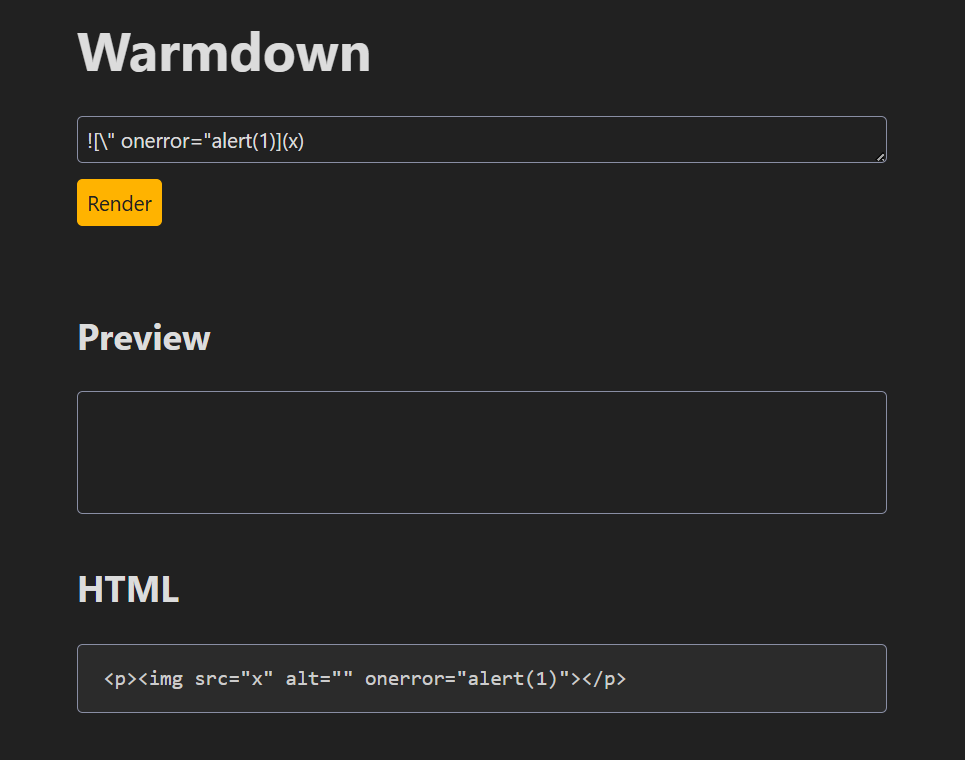 markdownを入力してXSSを発火させる問題。どのようなhtmlにパースされるかまで表示してくれるらしい。親切すぎる。