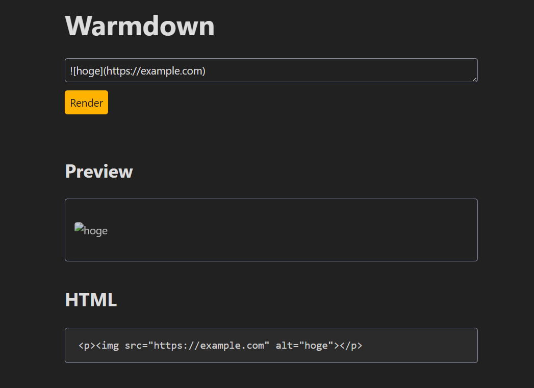 ざっと眺めて、markdownでは画像のalt属性の値を設定できることを思い出す。例えば![hoge](https://example.com)を入力してみると、alt属性の値がhogeになっていることが分かる。
