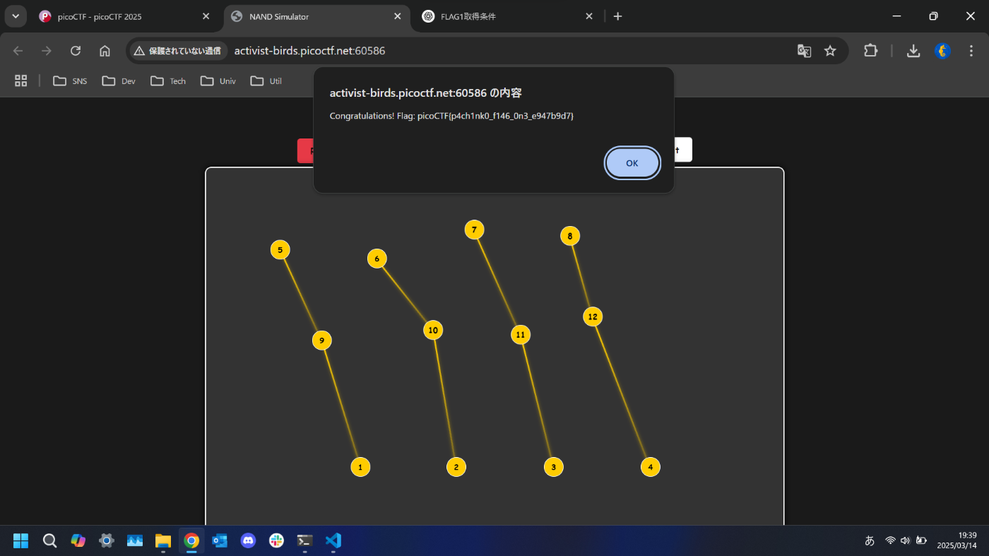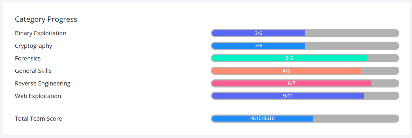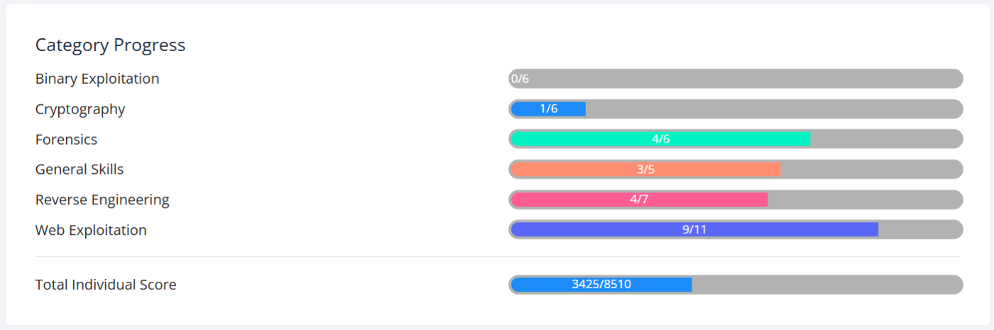 ぼーっと携帯を眺めていたらハッカソンで出会った方からお誘いいただいたので、チームCyberForgeでpicoCTF 2025に参加してきました。開催期間がSecHack365の成果発表会や未踏ITの提案書執筆と重なっていたのであまり時間は取れませんでしたが、4610ptを獲得し10460チーム中399位、日本の学生チームに限定すると140チーム中19位でした。